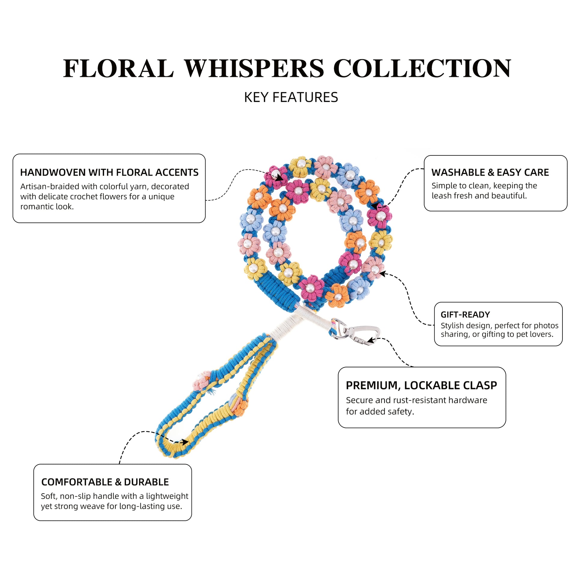 Bright and joyful, the Rainbow Melody Leash is a harmony of vibrant colors woven together like music in motion. Accented with playful floral details, itโs made for pups who shine with personality.